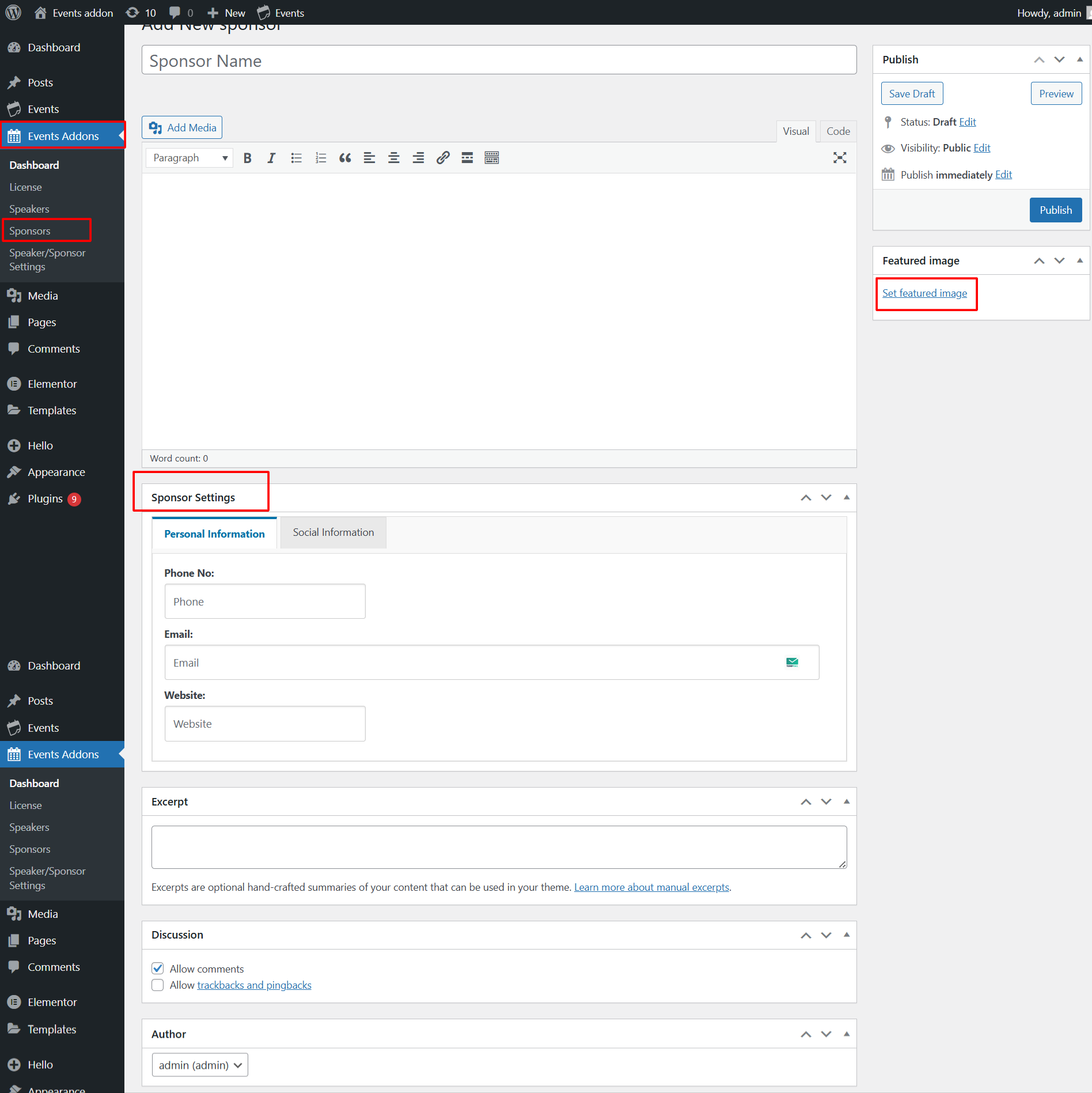 - Use the Set Featured Image option to upload the sponsor’s logo or business image.