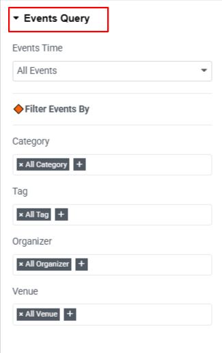 • Events Time: Choose whether to display: All Events, Upcoming Events, or Past Events.