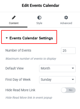• Number of Events: Set the maximum number of events to display in the calendar.