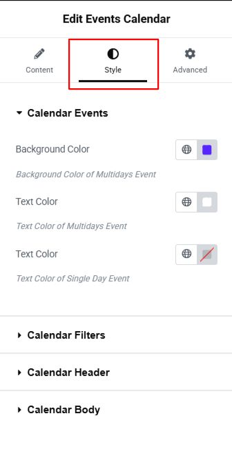 • Calendar Filters: Style your calendar’s filter options, including colors, fonts, spacing, and alignment, according to your site’s design.