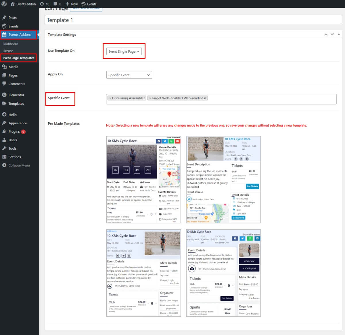 - Pre-made Templates: Select the template from the 4 pre-made templates for the selected events.