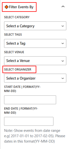 - In the Events Query tab, go to Filter Events By → Select Organizer.