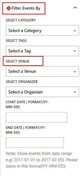 The Events Shortcodes addon allows you to filter and display events created by a specific Organizer, Category or happening at a particular Venue.
