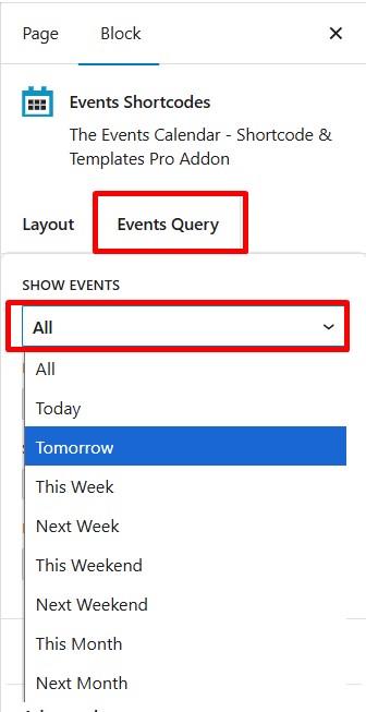 With the Events Shortcodes addon, you can easily display events based on specific time filters like today, tomorrow, this week, and more. Simply select your desired filter, and the setting will automatically apply to your shortcode.