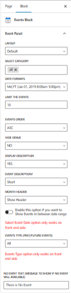 Important: To use the Events Block, you must install and activate the Events Block plugin along with the Events Shortcode plugin.