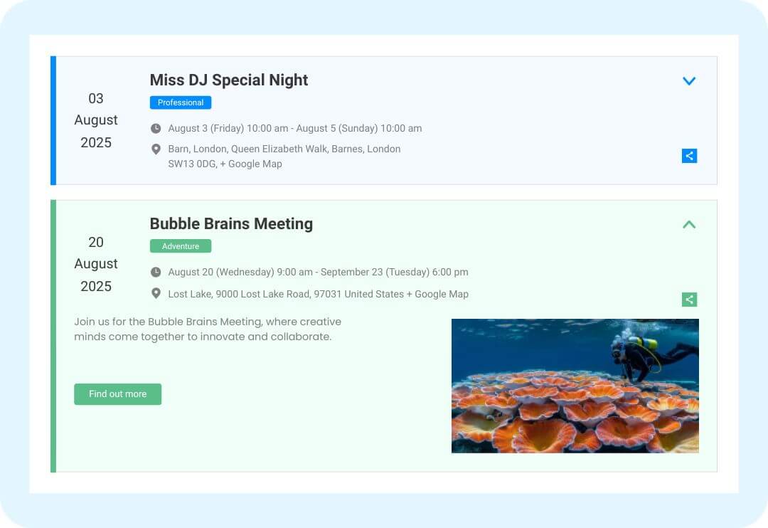 Showing your events in Accordion view helps increase the user experience by showing events details with in the event list.
