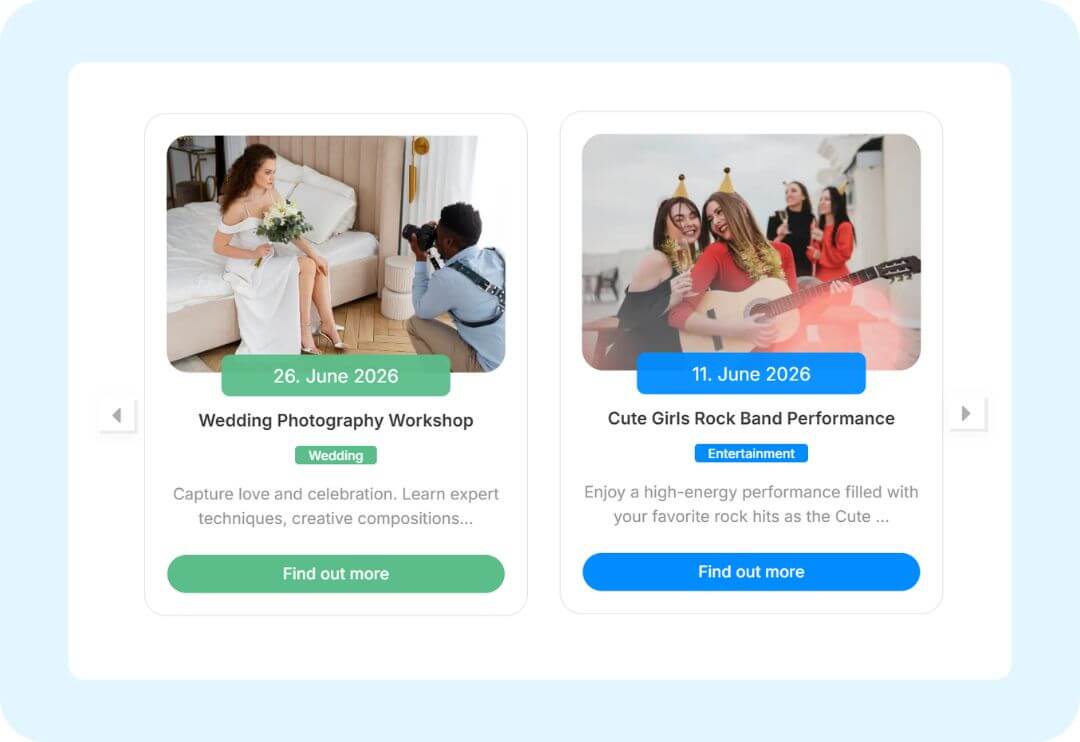 You can display your events easily in slider and carousel layout.