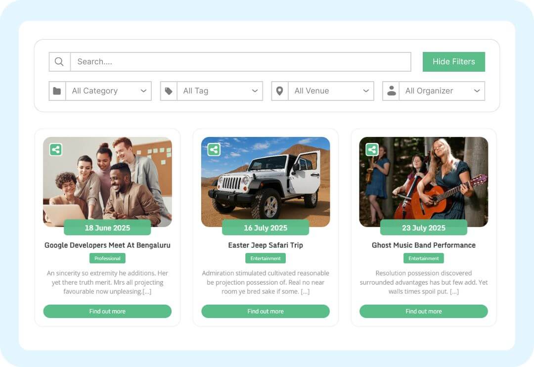 Add simple shortcode to show your events in ultimate layouts with multiple designs.